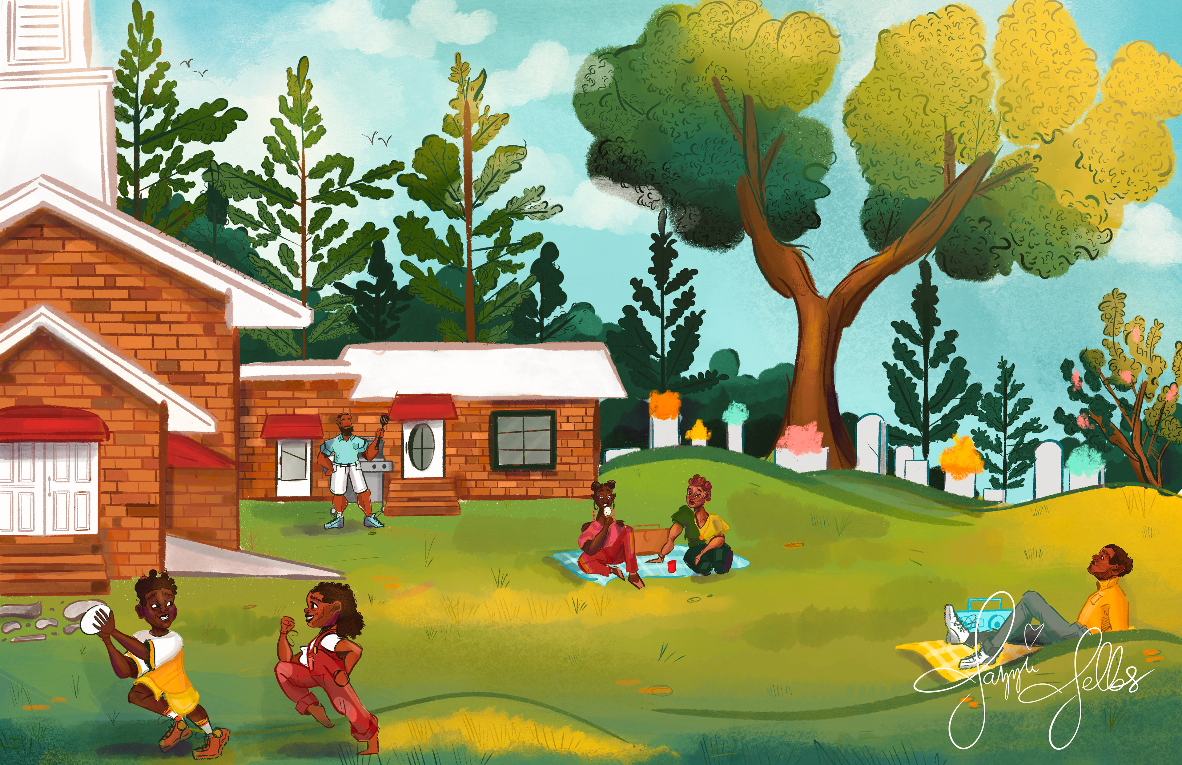 A digitally illustrated ode to a generational holiday originated and celebrated within the Black American community here in the United States—Decoration Day. More widely known as Memorial Day within the States, the holiday was initiated by Black Americans in honor of their fallen loved ones and community members in a post-Civil War tribute in the late 19th century. This longtime tradition has since passed down from generation to generation, resulting in annual celebrations as shown in the illustration to honor deceased relatives and loved ones on the last Sunday of May.